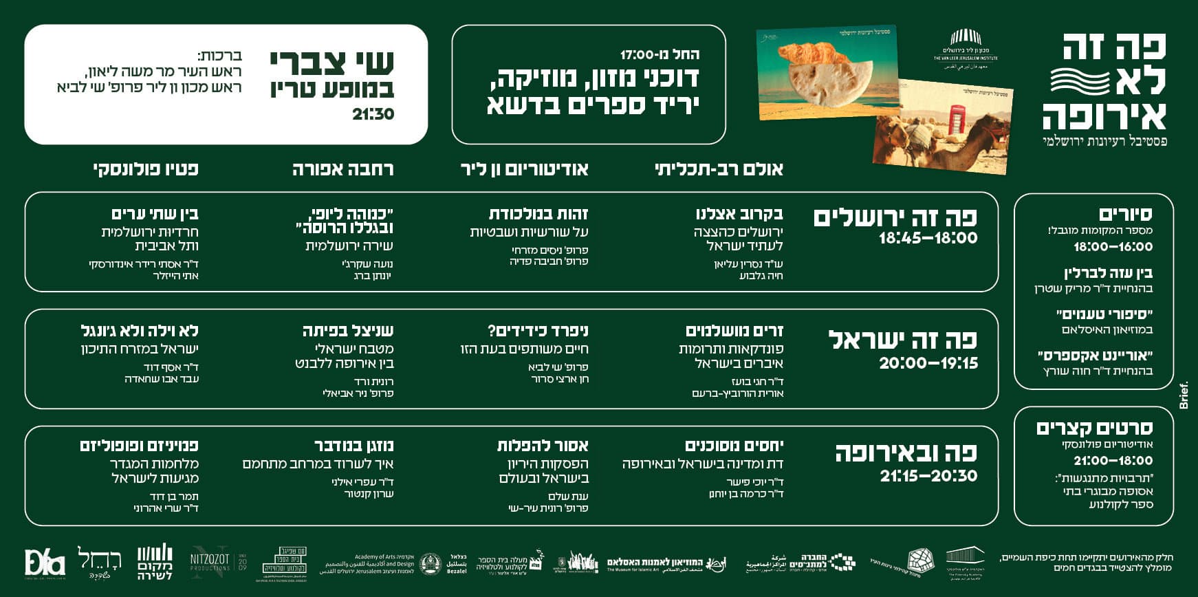 אנחנו מזמינים אותך לבוא, להקשיב ולהשתתף בשיחות מרתקות בשלל נושאים – מקומיות ישראלית ותופעות גלובליות, שירה ירושלמית ואוכל אירופי, משבר האקלים וחרדיות תל אביבית, ועוד ועוד...