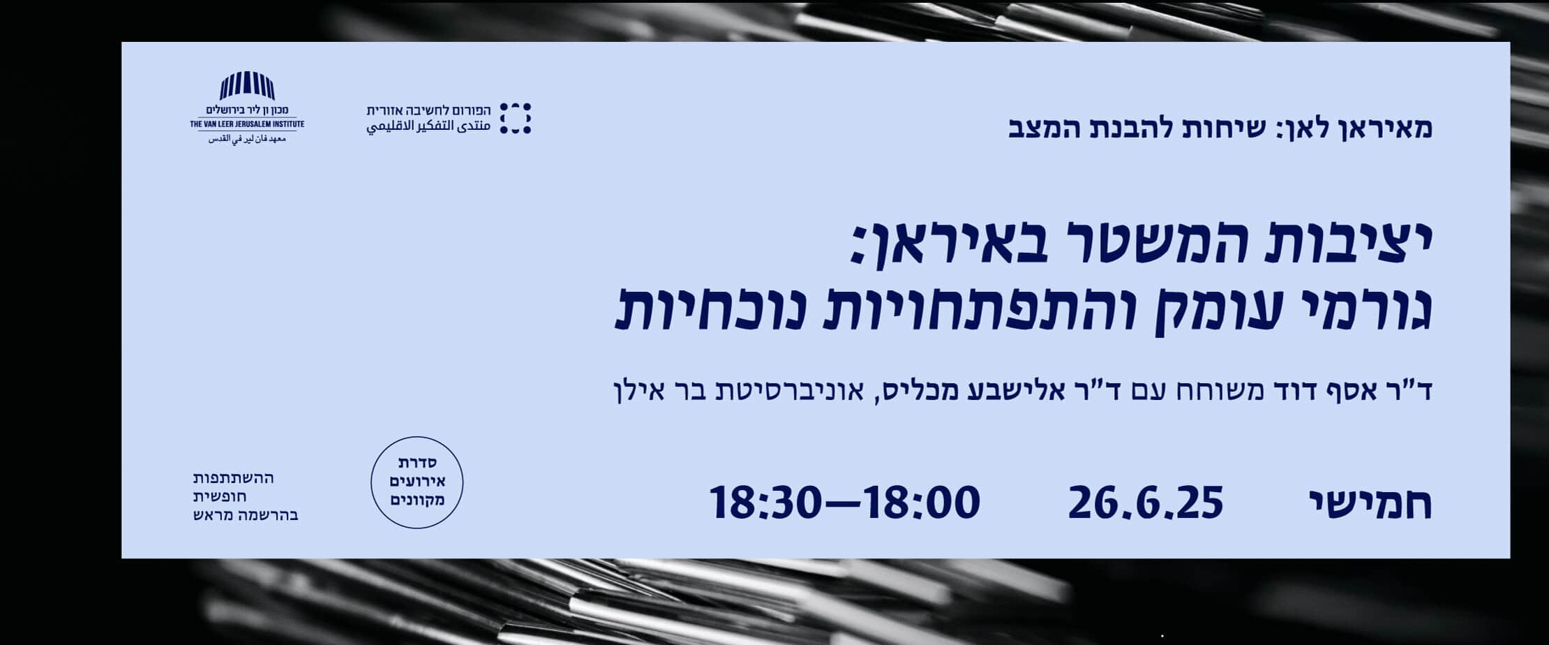 עבור פוליטיקאים ועיתונאים ישראלים הפכה ההתקפה הישראלית באיראן להזדמנות להפלת המשטר כשלב המכריע במהלך להקרסת "הציר השיעי", ובשאיפה לכינון משטר פרו-מערבי באיראן כבעבר. אף שחלקים גדולים מהעם האיראני מתנגדים למשטר האייתולות, יש לשאול האם יש בכוחה של התקפה חיצונית להביא לנפילתו של משטר פוליטי, או שמא היא דווקא מחזקת את הלכידות הפנימית והרוח הפטריוטית בעם. בשיחה נשאל מי הם הגורמים האופוזיציוניים במדינה, מה הרכב הדמוגרפיה באיראן, האם המתנגדים למשטר המהפכה תומכים בהחזרת השאה, כיצד נתפסת ההתקפה הישראלית בקרב זרמים שונים בחברה האיראנית, ואילו מנגנונים מסייעים למשטר הנוכחי לשמור על כוחו.