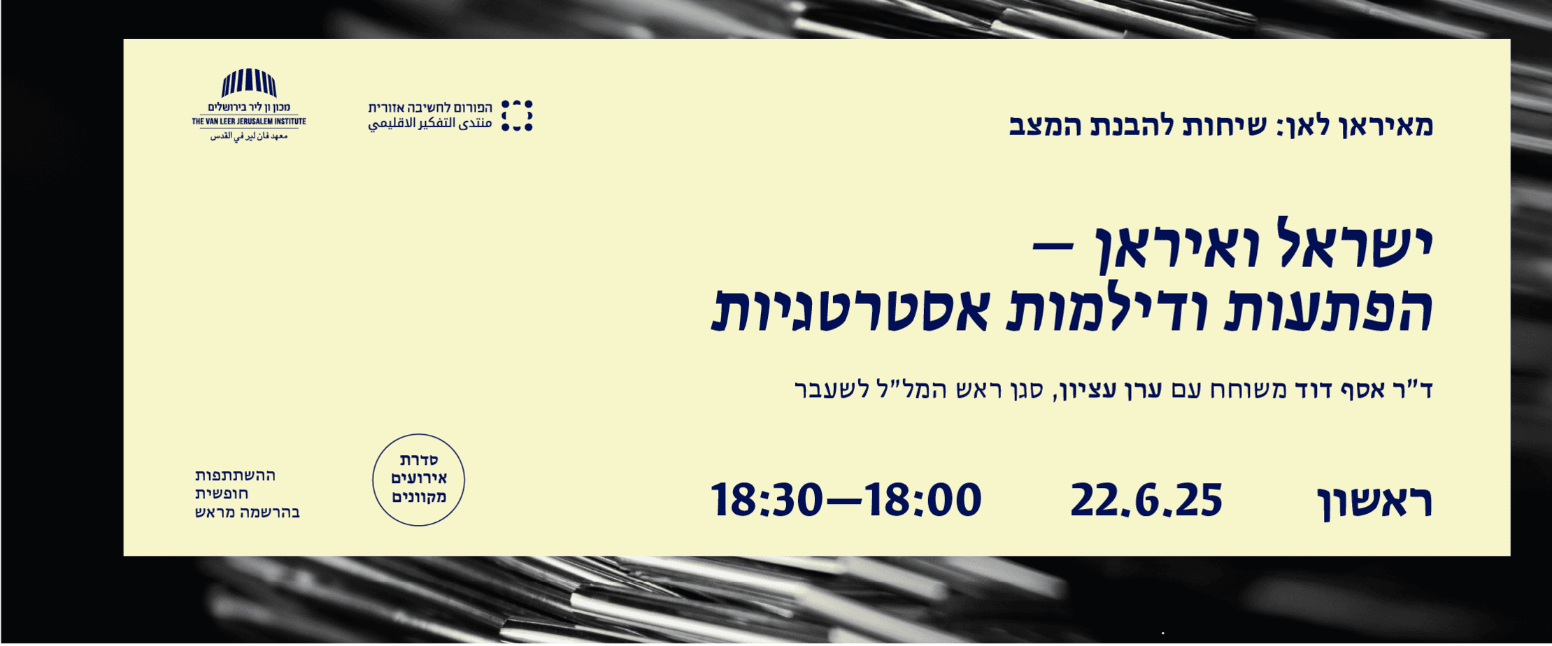 ד"ר אסף דוד, ראש תחום ישראל במזרח התיכון במכון ון ליר ומייסד שותף של הפורום לחשיבה אזורית משוחח עם ערן עציון, ראש תוכנית איראן במכון מיתווים וסגן ראש המל"ל לשעבר.