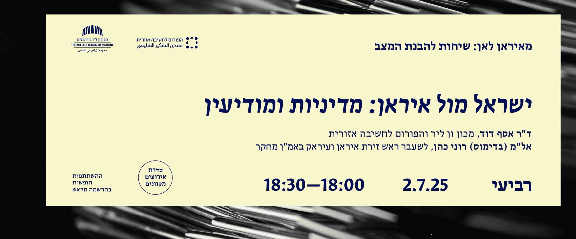 ד"ר אסף דוד, מכון ון ליר והפורום לחשיבה אזורית בשיחה עם אל"מ (בדימוס) רוני כהן, ראש זירת איראן ועיראק באמ"ן מחקר לשעבר