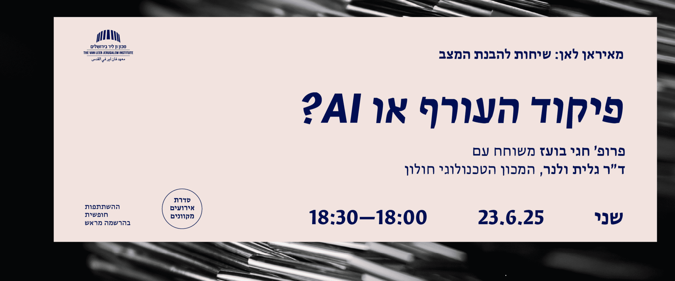 האם מערכות בינה מלאכותית יכולות להחליף את פיקוד העורף? כיצד מערכות כאלה היו פועלות? האם ההתרעה היתה ממוקדת, מדויקת וברורה יותר? ומה לגבי תמיכה לוגיסטית ונפשית שתפורה - בהתבסס על רישומי נתונים אישיים - במיוחד למידות של כל אחד מאיתנו? בשיחה זו ישוחח פרופ' חגי בועז, ראש תחום מדע, טכנולוגיה וחברה במכון, עם ד"ר גלית ולנר מהמכון הטכנולוגי חולון על האפשרויות והמגבלות הטמונות ביישומים מתקדמים של טכנולוגיה מבוססת בינה מלאכותית במצבי חירום בכלל ובניהול העורף בפרט. בין השאר יעלו הסוגיות של אחריות, שקיפות, הטיות, פרטיות, ביטחון אי שויון וטעויות אנושיות מול הזיות של AI.