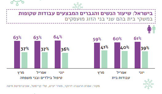 גם במהלך חודשי הקורונה, מתברר, הנשים עודן האחראיות העיקריות לעבודות הבית ולטיפול במשפחה, ובכך משתמר החסם להשתלבות מלאה ושוויונית שלהן בשוק העבודה. ליתר דיוק, הנתונים מראים כי בתקופות הסגר בישראל בוצעו עבודות הבית ב-60% מהמקרים בידי נשים לעומת 40% בידי גברים, וטיפול בילדים ובני משפחה בוצע ב-63% מהמקרים בידי נשים לעומת 37% בידי גברים. המצב בעולם – בריטניה, גרמניה, ארה"ב – דומה.
