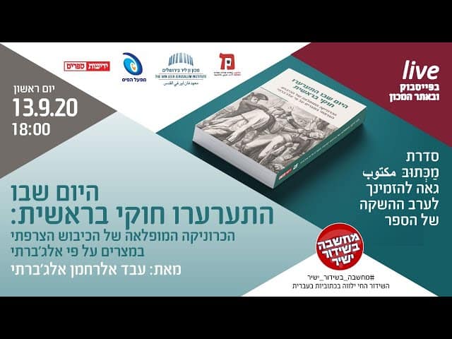 מכון ון ליר וסדרת מכּתוּבּ גאים להזמינך לערב ההשקה של הספר "היום שבו התערערו חוקי בראשית: הכרוניקה המופלאה של הכיבוש הצרפתי במצרים על פי אלג'ברתי", 13.09.20