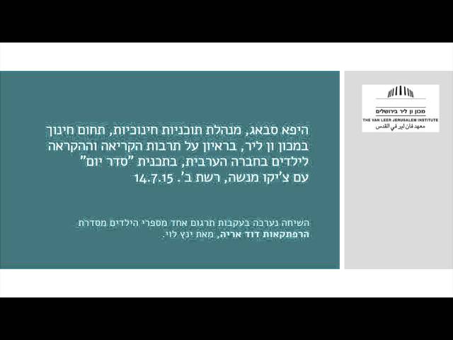 היפא סבאג, מנהלת תוכניות חינוכיות, תחום חינוך במכון ון ליר בריאיון בתכנית "סדר יום" עם צ'יקו מנשה. רשת ב', 14.7.15