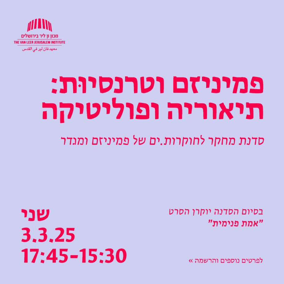 בתאריך 3.3.25 תתקיים סדנת מחקר המסכמת את עבודתה של הקבוצה. הדיון בסדנה יעסוק בממשקים ובמתחים שבין פמיניזם לטרנסיוּת ויעמוד על ההשלכות התיאורטיות, המחקריות והמעשיות של הנושא על כלל תחומי הפמיניזם והמגדר. הסדנה מיועדת לחוקרות.ים (מתואר מוסמך ומעלה).