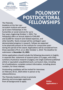 The Polonsky Academy at the Van Leer Jerusalem Institute invites applications for up to six Polonsky Postdoctoral Fellowships in the humanities or social sciences tenable for up to five years, beginning October 1, 2019. The Fellowship offers an annual stipend of $40,000. Yearly renewal will be contingent upon demonstrated progress in research. Fellows are expected to be physically present at the Institute for consecutive years during the period of the award. Applications will be considered from those awarded a Ph.D. on or after October 1, 2012. The deadline for submissions is January 7, 2019.